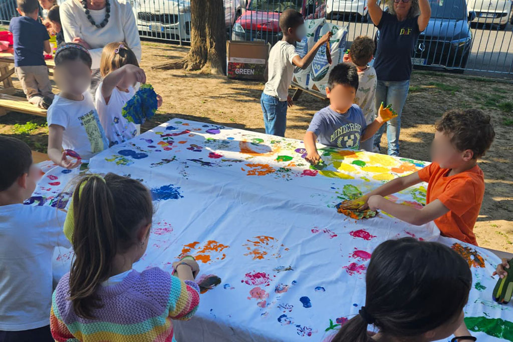 In particolare, tra i momenti più significativi, la realizzazione di una grande tela dipinta con frutta e verdura: un’attività creativa che unisce espressione artistica e sensibilizzazione, trasformando ingredienti naturali in strumenti di gioco e apprendimento.
